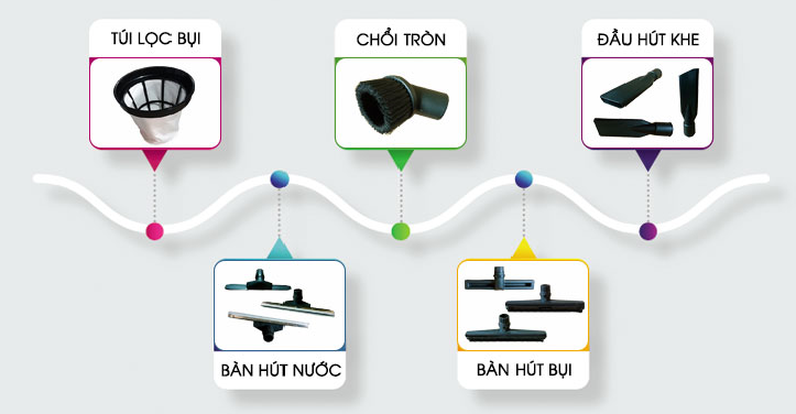 - Phụ kiện kèm theo: Ống hút, bàn hút bụi, bàn hút nước, đầu chổi tròn, đầu hút khe